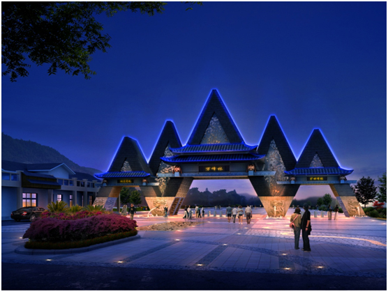 主题立意:大门整体造型取意于万峰林,是将“万峰林立”的壮阔之势浓缩为“五峰并峦”的秀美之姿。并在结构、外饰上充分融合当地独特的地域文化、民族文化元素,形成完整的、能够充分体现景区景观特色和当地文化特色的标志性景观大门。